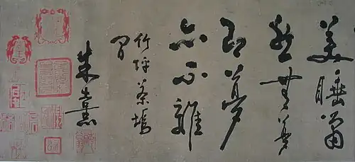 Zhu Xi had, from an early age, followed his father and a number of great calligraphers at the time in practicing calligraphy. At first he learned the style of Cao Cao, but later specialized in the regular script of Zhong Yao and the running cursive script of Yan Zhenqing. Though his manuscripts left to the world are piecemeal and incomplete, and most of his works are lost. Moreover, his fame in the realm of philosophy was so great that even his brilliance in calligraphy was overshadowed. He was skillful in both running and cursive scripts, especially in large characters, but extant artworks consist mainly of short written notes in running script and rarely of large characters. His authentic manuscripts are collected by Nanjing Museum, Beijing Palace Museum, Liaoning Province Museum, Taipei Palace Museum and the National Museum of Tokyo, Japan. Some pieces are in private collections in China and overseas. The Thatched Hut Hand Scroll, one of Zhu Xi's masterpieces in running-cursive script, is in an overseas private collection.
