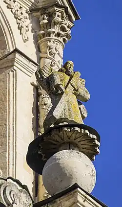 The cornice of the church is richly decorated; especially luxurious is its frieze entirely covered with ornaments. False windows are installed on the pediments around the entire circumference of the church. There are four small figures of Angels above each false window in the attic. Statues of Cherubs on ball pedestals are located between the false windows. These eight Cherubs installed on the roof of the church hold the tools of Christ's Passions: Spear, Ladder, Cross, Nails, Crown of Thorns, Sponge, etc.[44]