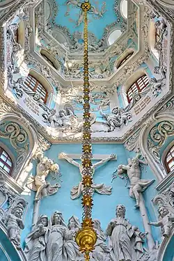 Lower register: on the eastern wall above the iconostasis – the relief scene Crucifixion. To the right of this scene is a Latin inscription indicated by two seated putti. Latin texts accompany other scenes as well, and are located in cartouches decorated with shells, acanthus leaves and garlands. According to historian I.V. Kuvshinskaya, "the Latin verses of the temple can be compared with a complex polyphonic choral performance of poems, the main theme of which is the theme of the sufferings of Christ on the Cross ...".[54]