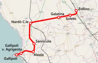 The Zollino–Gallipoli railway is an Italian 34-kilometre (21-mile) long railway line that connects Lecce and Zollino with Gallipoli in the region called Apulia.