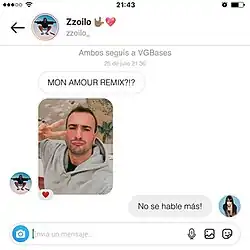 After the song started to become more popular, singer Aitana tweeted the lyrics to the track on July 25. Both artists interacted on social media about a possible collaboration, which ended up being the remix to "Mon Amour". The Instagram private message conversation between the two is reflected in the single's cover.[8] The duet was recorded in Madrid on July 30. Zzoilo later told the press that Aitana's work during 2020 and her sophomore album 11 Razones were a huge inspiration for the final conception of the song. He stated "we played her latest album because the drums seemed spectacular to us and we wanted to make the song in that style. In the end, it did not stay that way. But Aitana has been part of Mon Amour from the beginning". The remix was finally released on August 17 to commercial success.